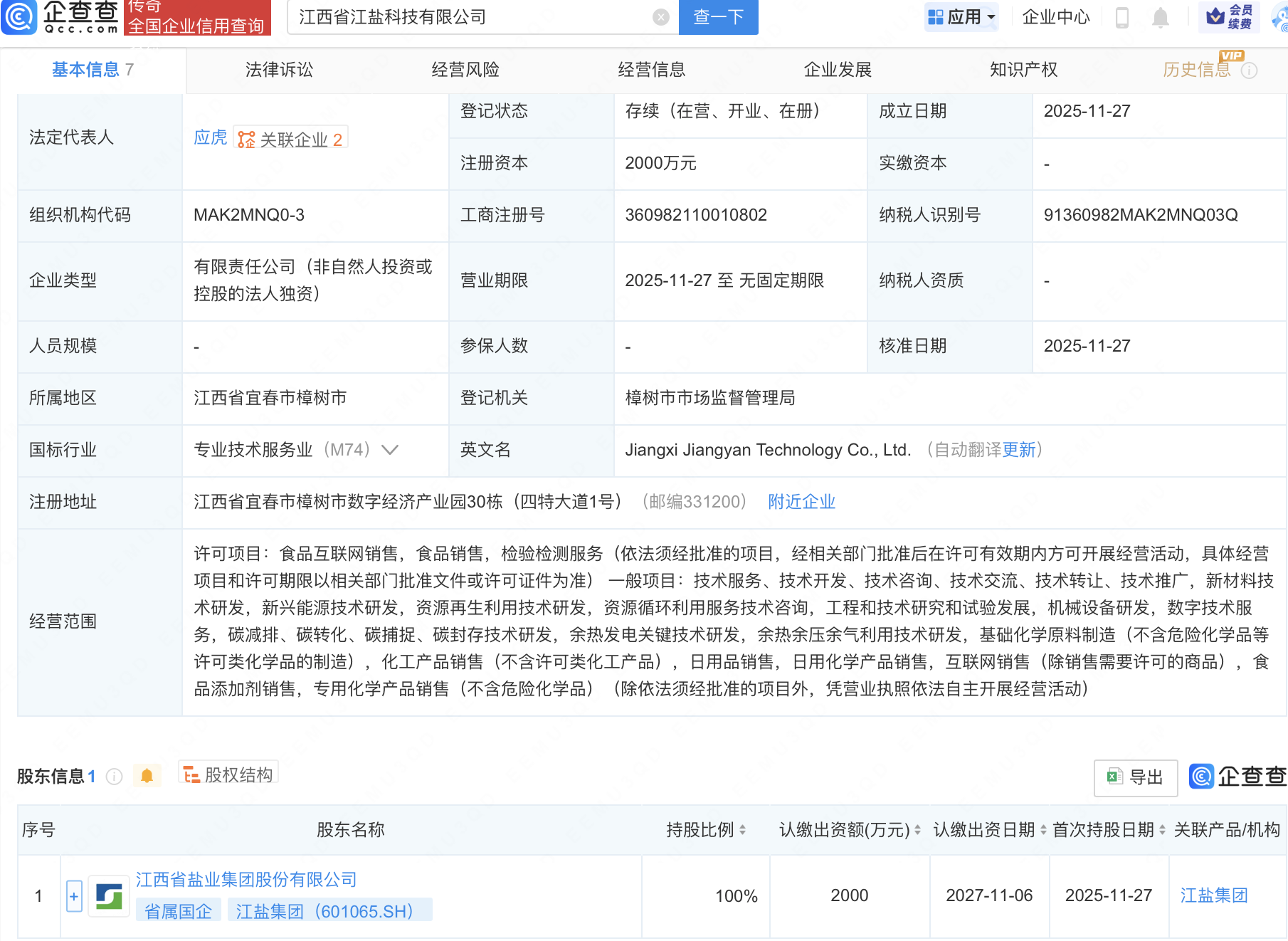 近日,江西省江盐科技有限公司成立,注册资本2000万元,经营范围包含:数字技术服务,碳减排、碳转化、碳捕捉、碳封存技术研发信捷策路,余热发电关键技术研发,余热余压余气利用技术研发等。企查查股权穿透显示,该公司由江盐集团(601065)全资持股。